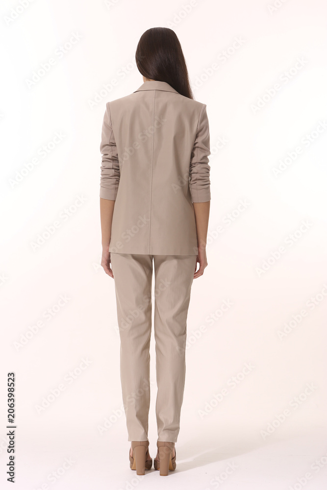 young caucasian business woman executive posing in blue official pantsuit high heels stiletto shoes full body length isolated on white back view