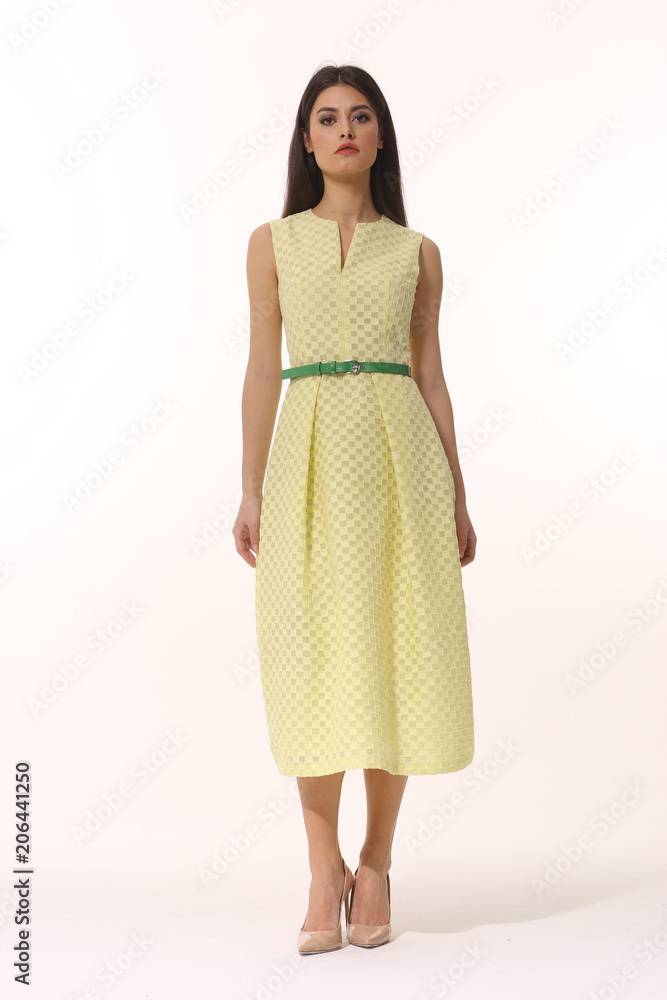 indian young student girl posing in designer formal long summer yellow dress short sleeves high heels stiletto shoes full body length isolated on white
