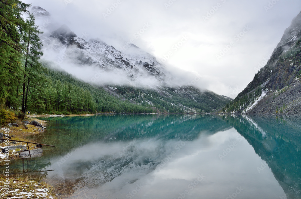 Туманное утро на берегу Шавлинского озера в августе, Республика Алтай, Россия