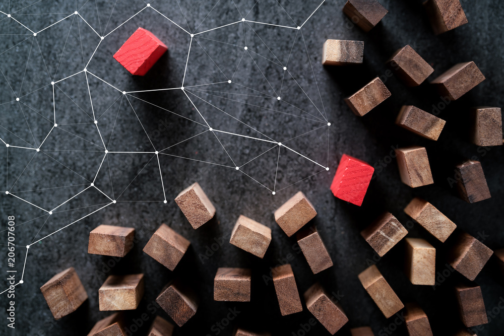 organization and leadership ideas concept with color wood block outstanding from brown wood block on grey background table