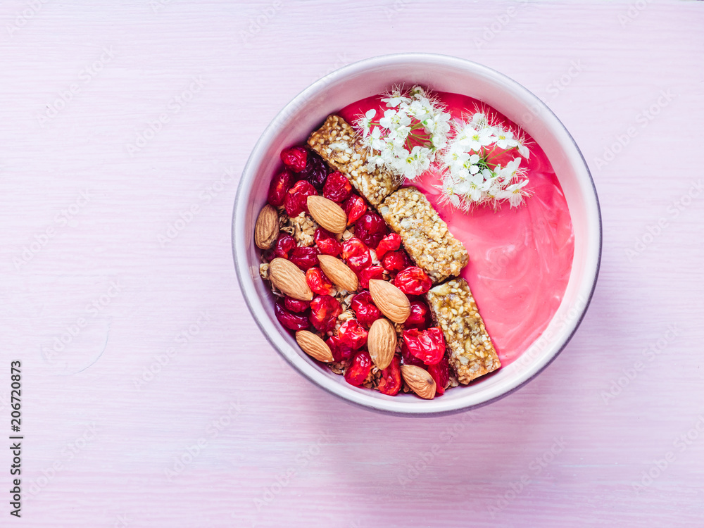 Beautiful flowers, berry smoothie, muesli with nuts, dry berries and pieces of banana in a plate on a stylish, pink table. Healthy and delicious food