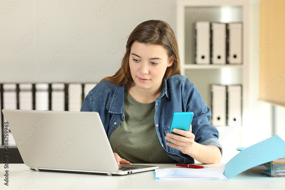 Intern working with a phone and a laptop