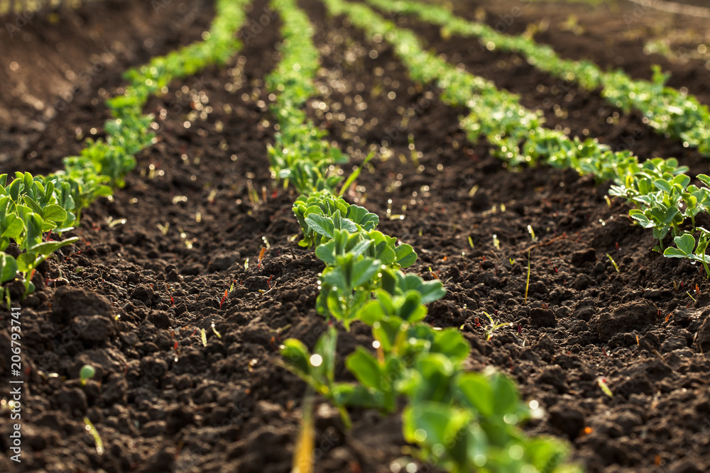 Small scale agriculture - peas in rows on a dewy morning