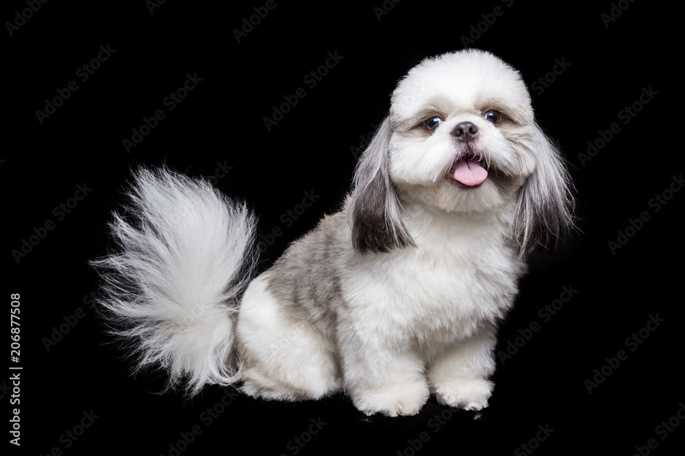 a shihtzu dog sitting on a black background