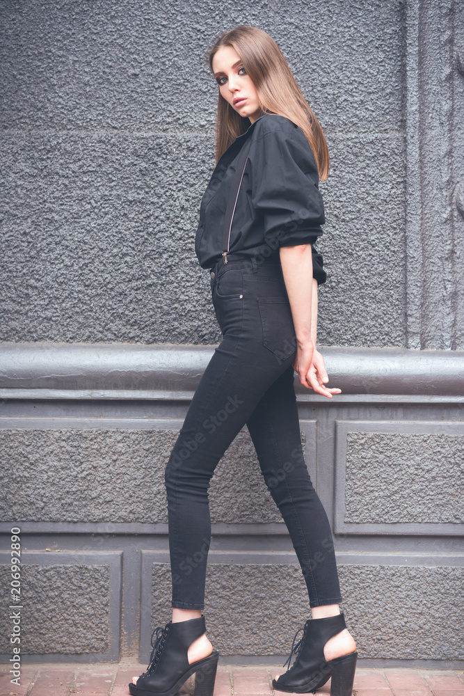 Beautiful girl in black clothes oversize with suspenders. Dark background. Toned image.