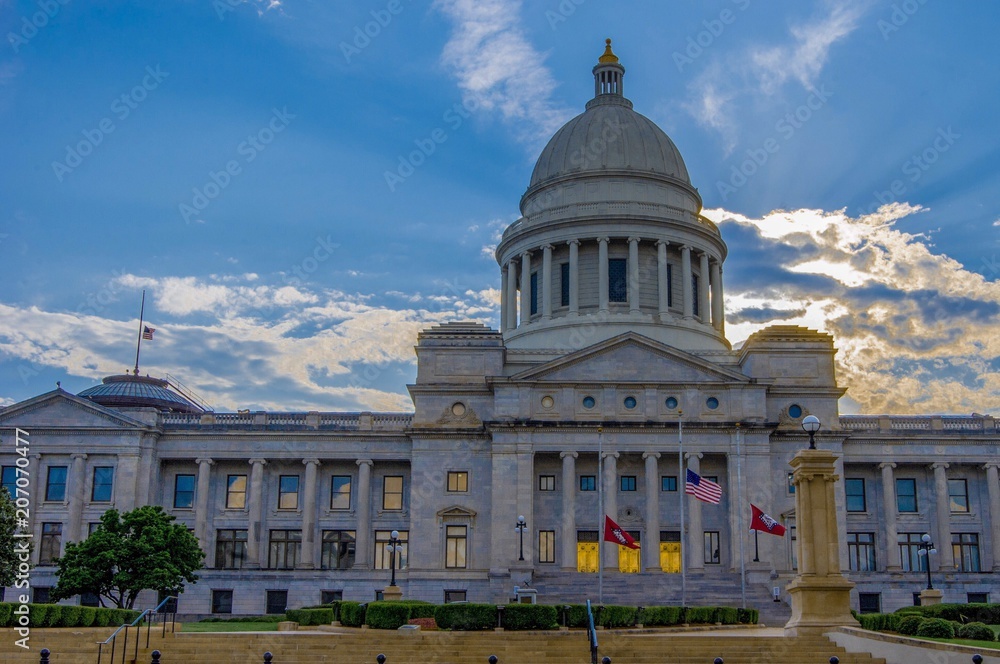 Arkansas state house with sunsetting behind clouds