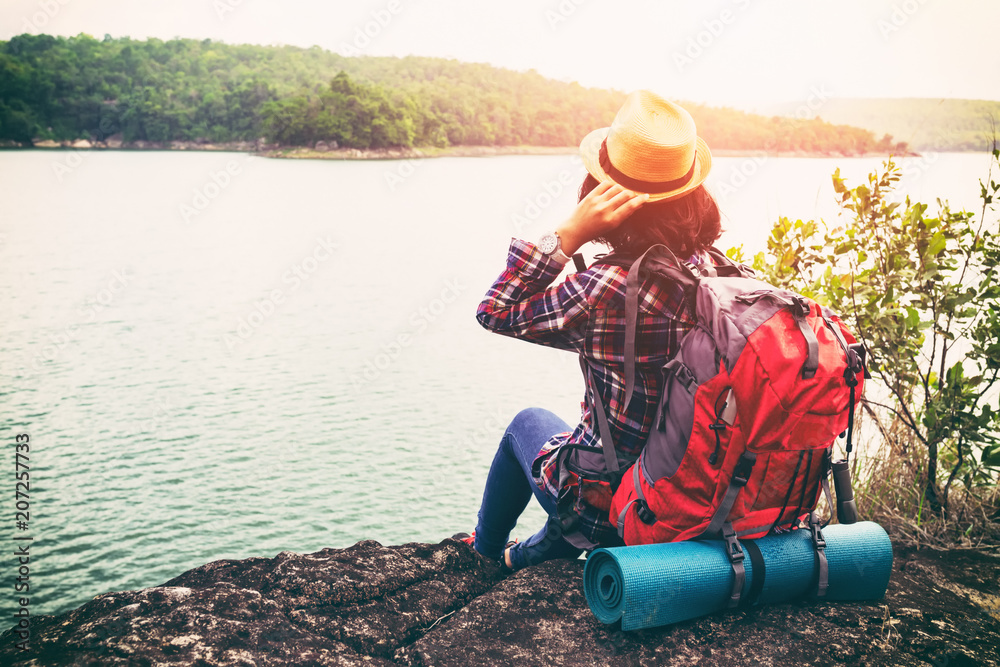 Young hipster woman with backpacker sitting on stone enjoying lake and mountain beautiful landscape view. This traveller happiness with trip in adventure of lifestyle freedom women stronger