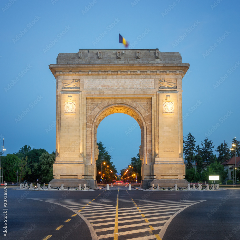 Bucharest, The Triumphal Arch (Arcul de Triumf) at dusk