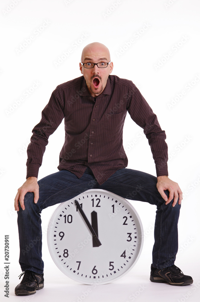 Mann sitzt auf Uhr 5 vor 12