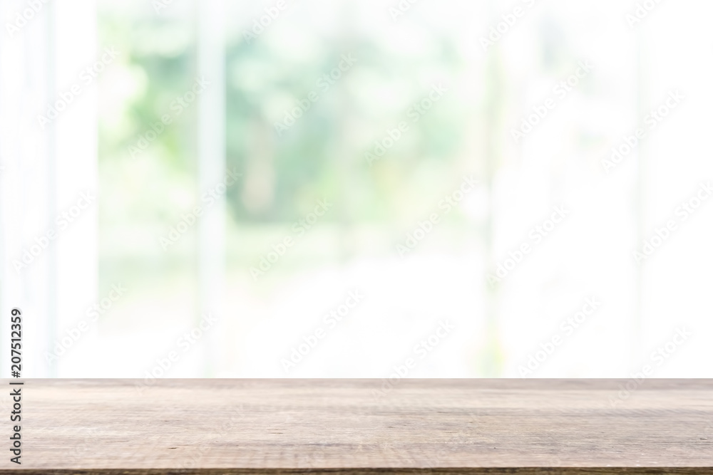 Empty wooden table and window room interior decoration background, product montage display,can be used for display or montage your products.Mock up for display of product.