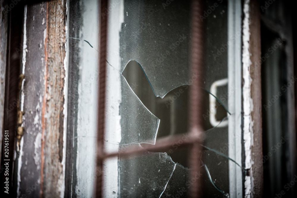 Smashed glass Window with old wooden frame on grunge wall damaged house
