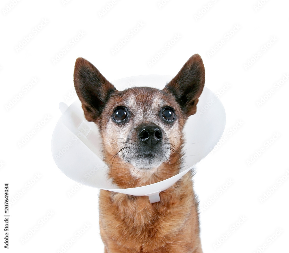 cute chihuahua with a collar cone on