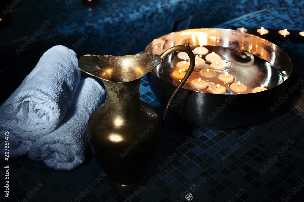 Scenery baths hammam, spa procedures. Copper jug, bowl with burning candles, white towels