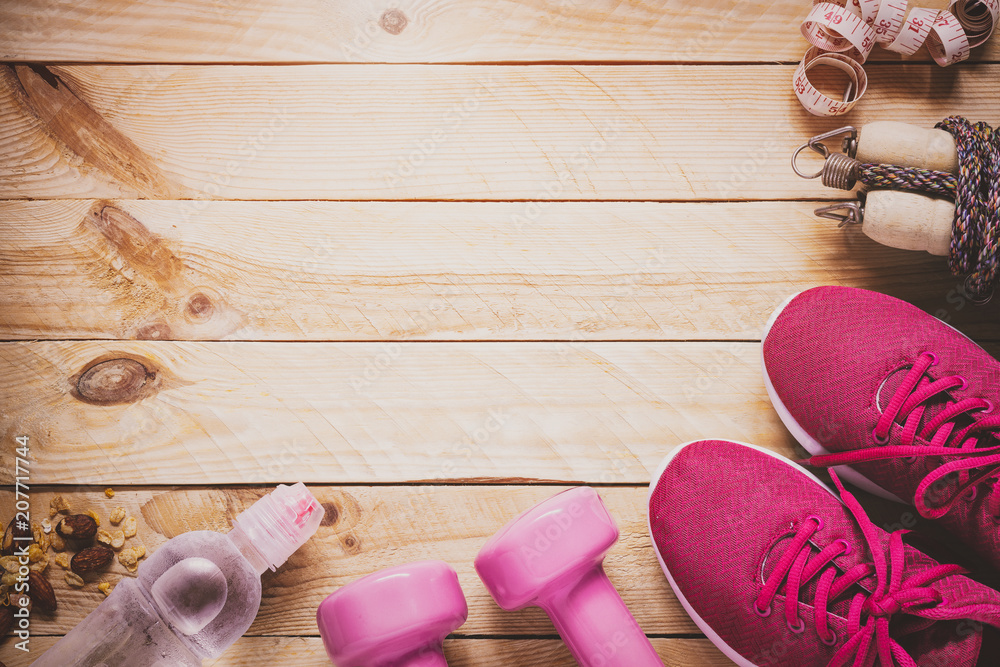 Body Care and Beauty, Weight and Dieting Healthy lifestyle concept. Sport equipment, Dumbbells, running shoes, skipping ropes on wooden background.