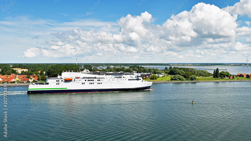 Modern ferry enters the port of Rostock. The ferry line connects the German port of Rostock with Gedser in Denmark.