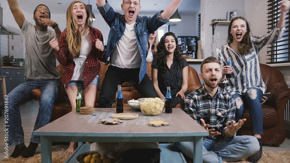 Friends watch sports on TV, celebrate success. Crazy football supporters fans group shout with arms raised. Euphoria. 4K