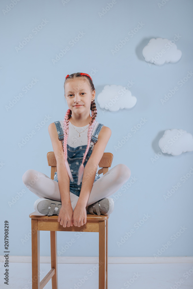 Stylish teenage girl is enjoying her modern kanekalon hair. little girl in fashionable denim overalls.girl sits on a wooden chair in the studio