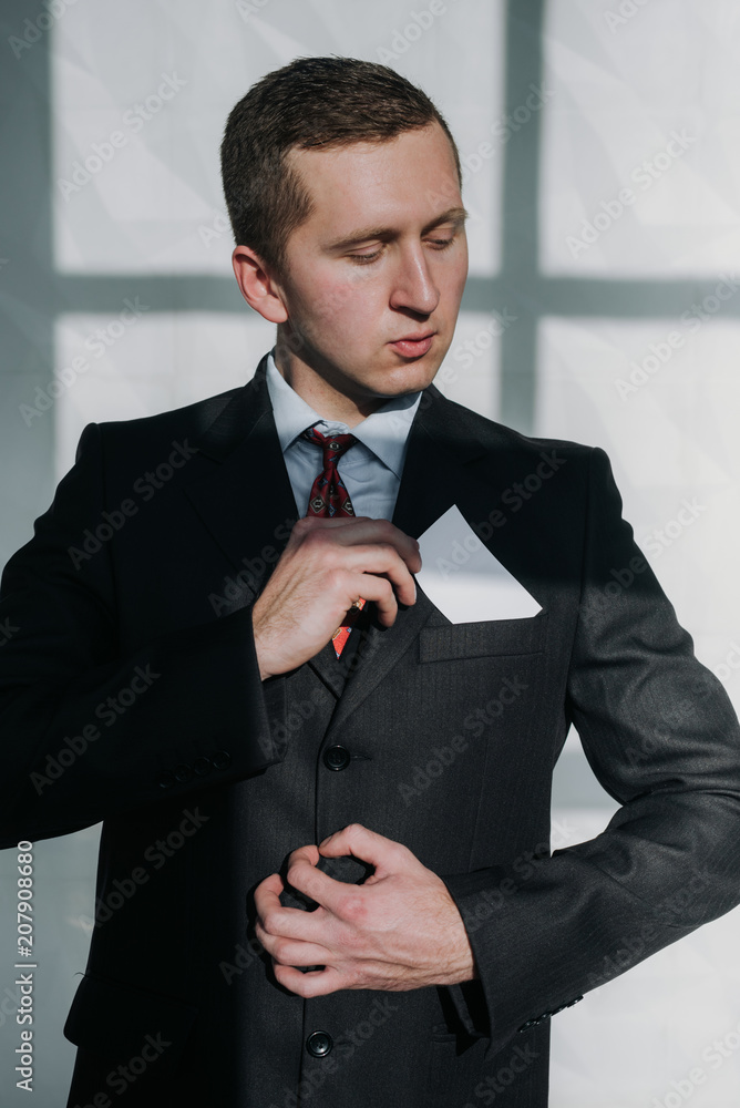 Businessman in suit holding empty business card. Isolated on white.Man in business suit showing blank card