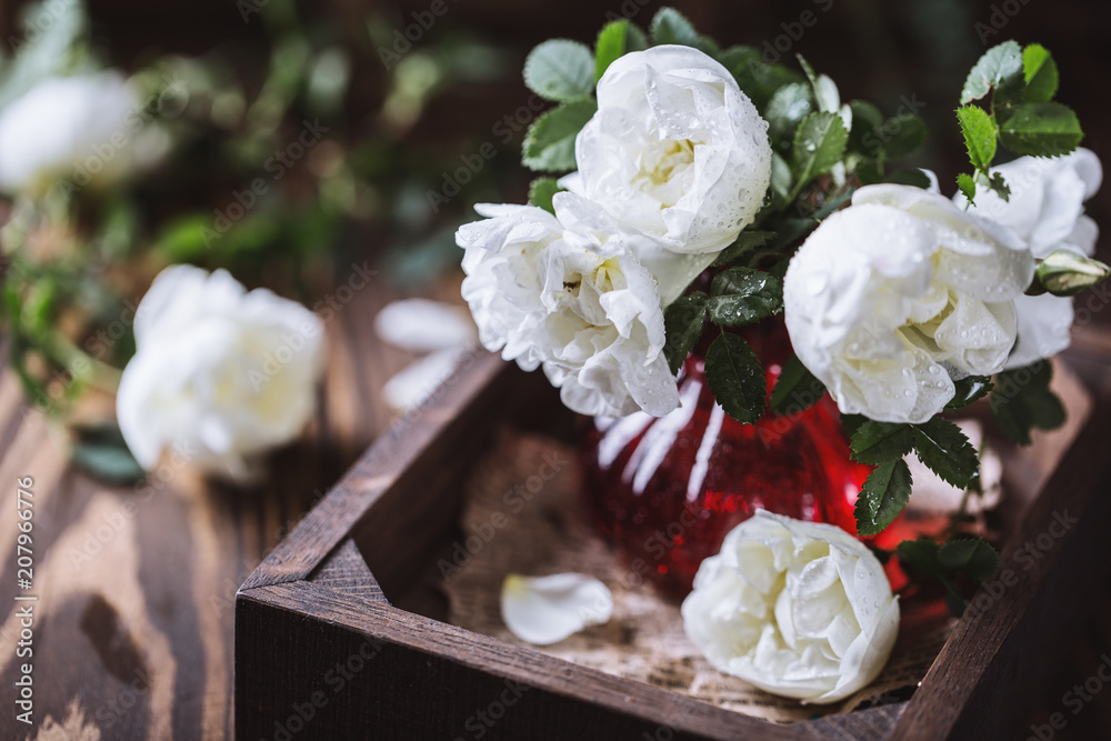 Bouquet of roses in a vase on wooden rustic background. Flower composition