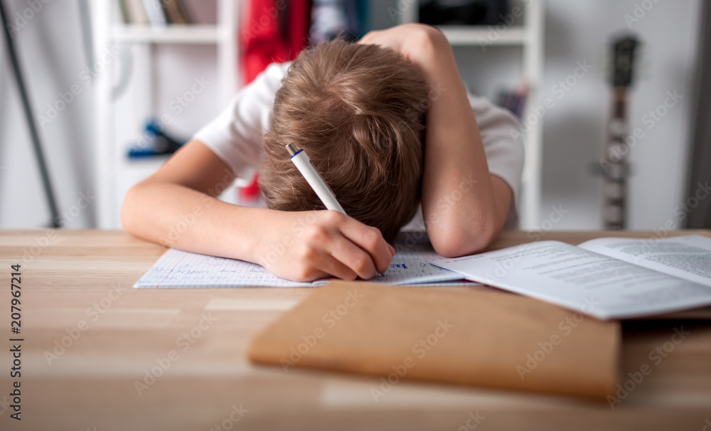 Bored and tired teenage boy doing homework on desk in his room