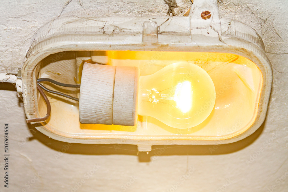 A burning lamp hanging on an old shattered wall