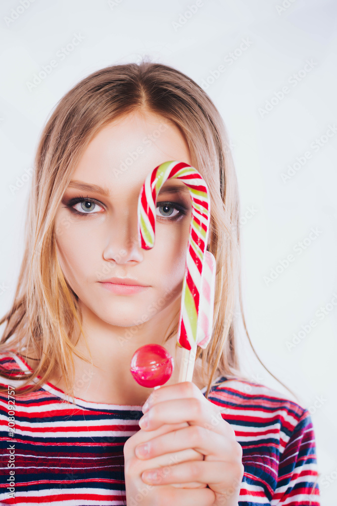 Close up of beautiful sexy woman model with pink lips and lollipop on white isolate background, profile. girl with professional makeup