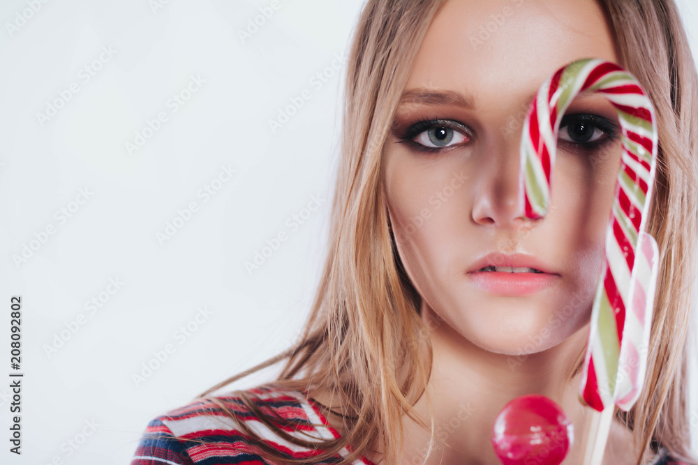 Close up of beautiful sexy woman model with pink lips and lollipop on white isolate background, profile. girl with professional makeup
