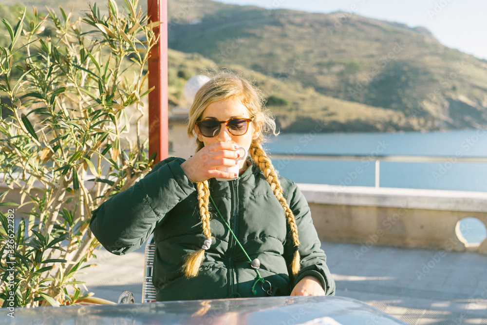 Real photo of a wooden shelf with ornaments in a living room with posters on a wall