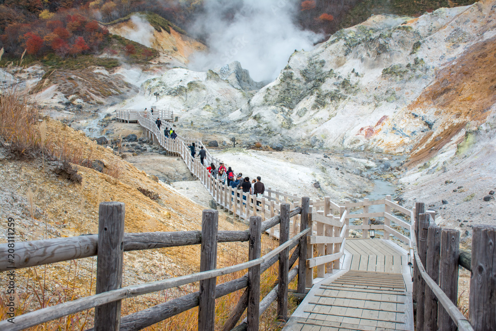 Jigokudani or Hell Valley in the town of Noboribetsu Onsen, hot steam vents, sulfurous streams and other volcanic activity, hot spring waters, Hokkaido, Japan.