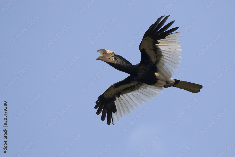 Black and white casqued hornbill that flies over the forest in the blue sky of Africa
