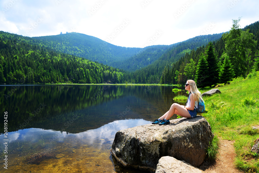 Tourist sitting on stone by moraine lake Kleiner Arbersee in National park Bavarian forest. Germany.