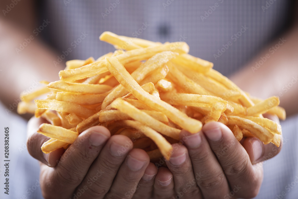 man with appetizing french fries in his hands