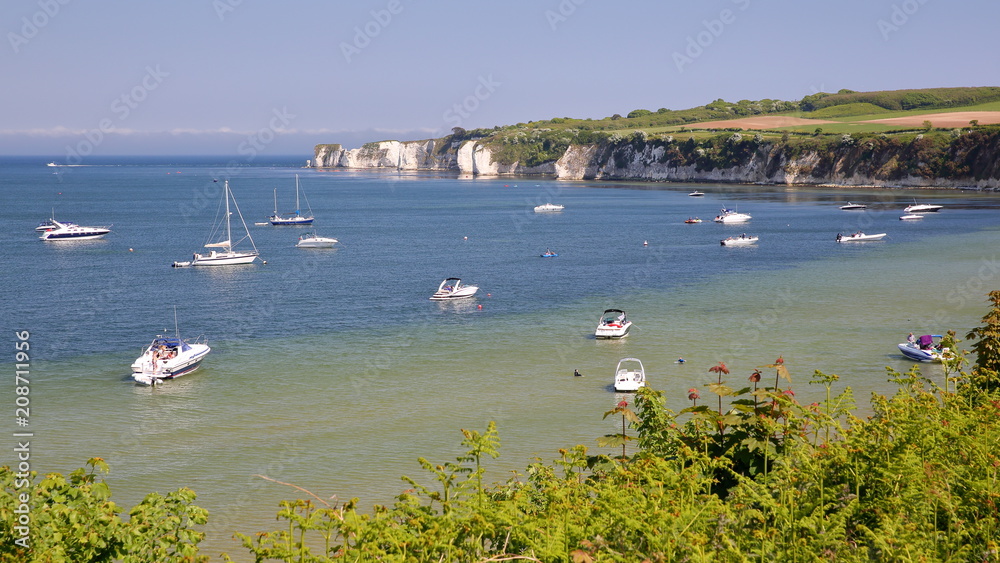 Studland bay with mooring boats and Old Harry Rocks in the background near Swanage, Isle of Purbeck, Dorset, UK