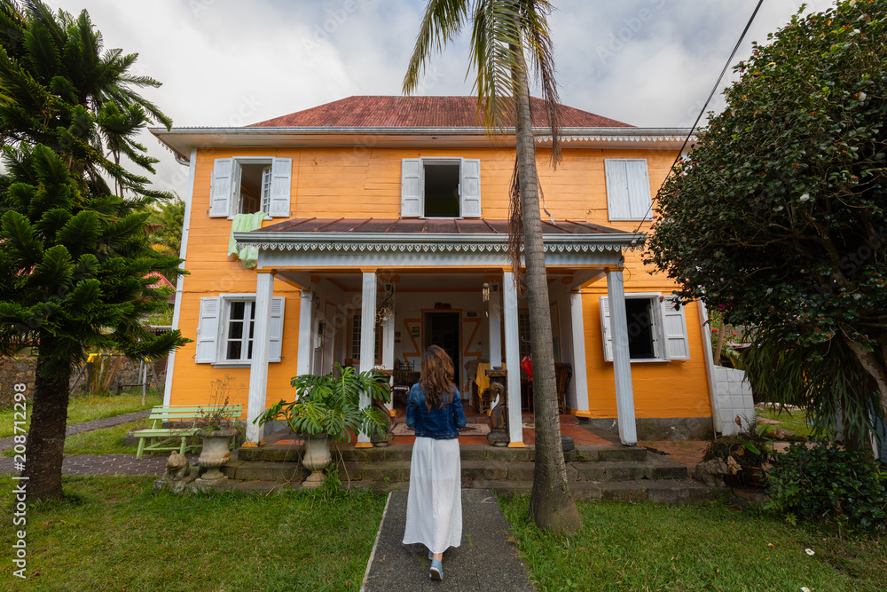 Girl in front of a case creole in Hell Bourg, Reunion Island