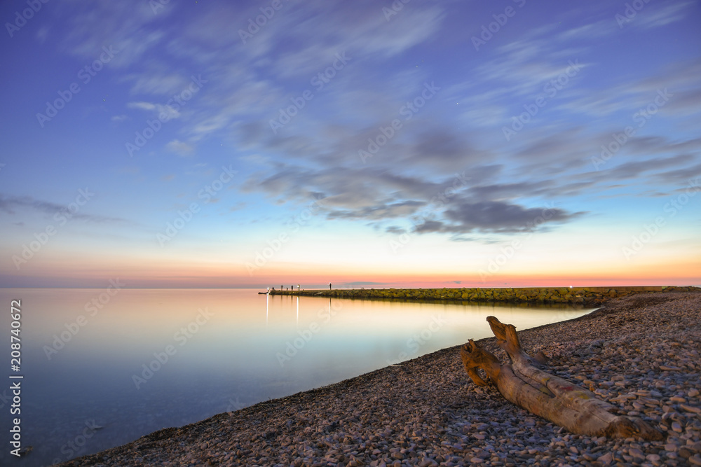Seascape, snag on the seashore, in the background breakwater, Black Sea, Small Bay, Anapa, Russia