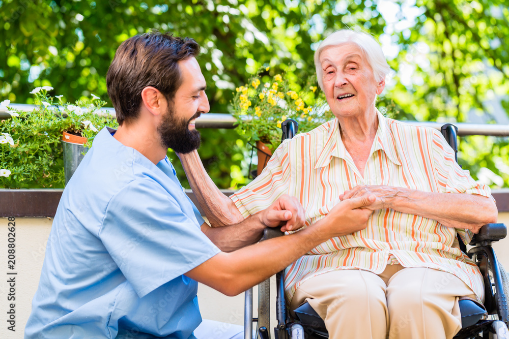 Pfleger hält Hand von Seniorin im Seniorenheim