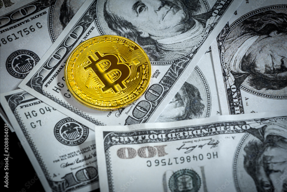 Golden Bitcoin on us dollars. cryptocurrency business concept