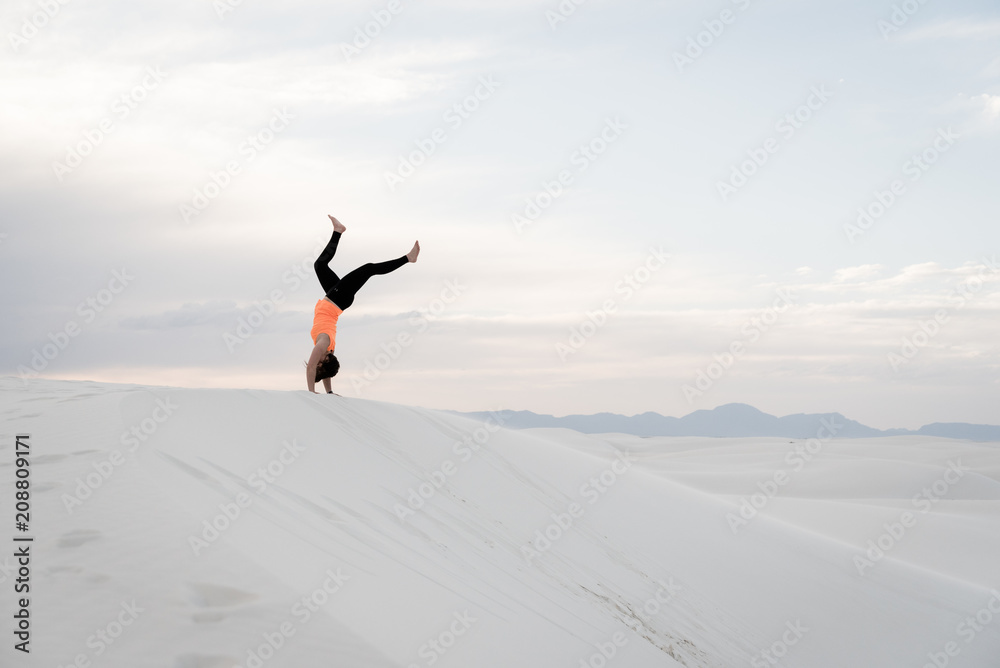 A woman flipping over a sand dune at White Sands National Monument in Alamogordo, New Mexico.