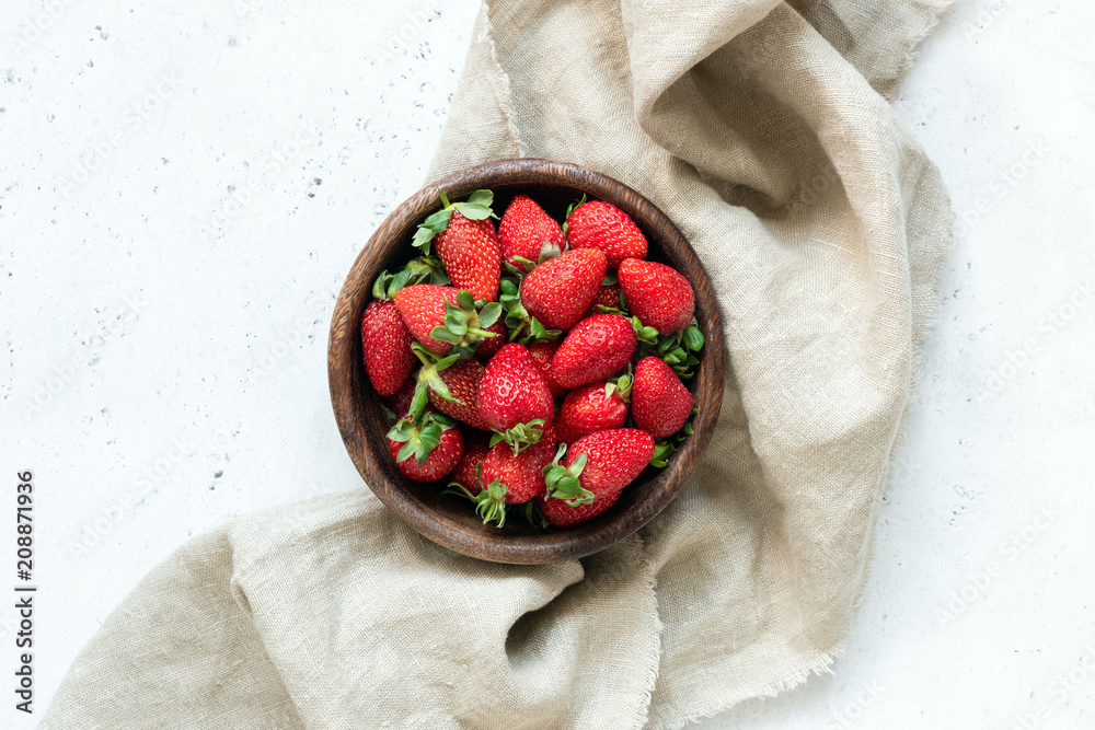 Fresh strawberries in bowl on gray background. Strawberry harvest. Top view of strawberries