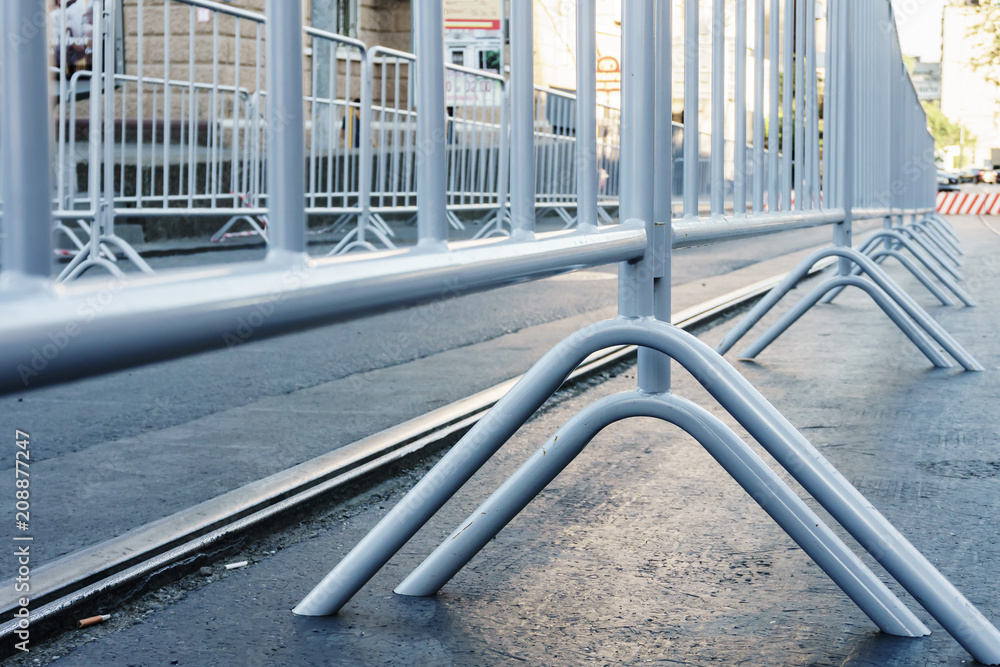 Portable metal grilles of light gray color for the obstruction of the territory and organization of the queue for the event