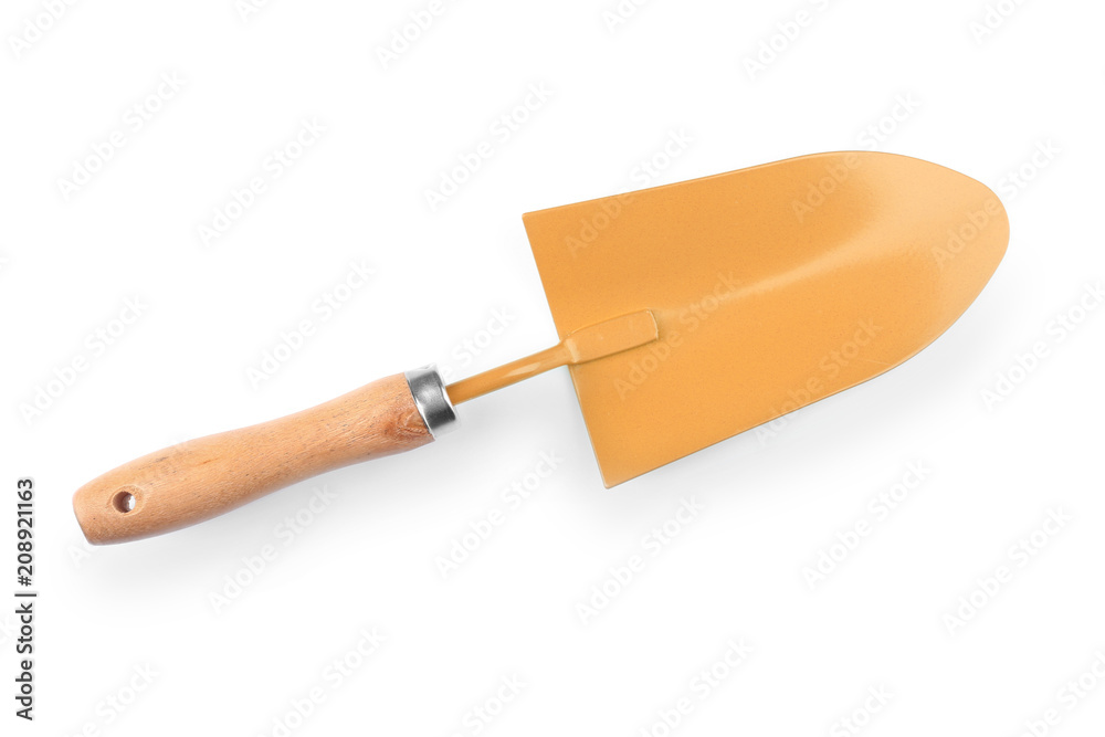 Metal shovel for gardening on white background