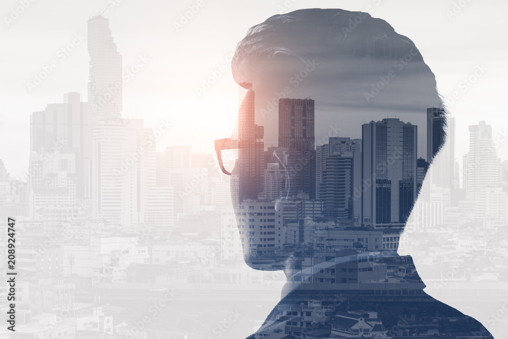 The double exposure image of the business man standing back during sunrise overlay with cityscape image. The concept of modern life, business, city life and internet of things.