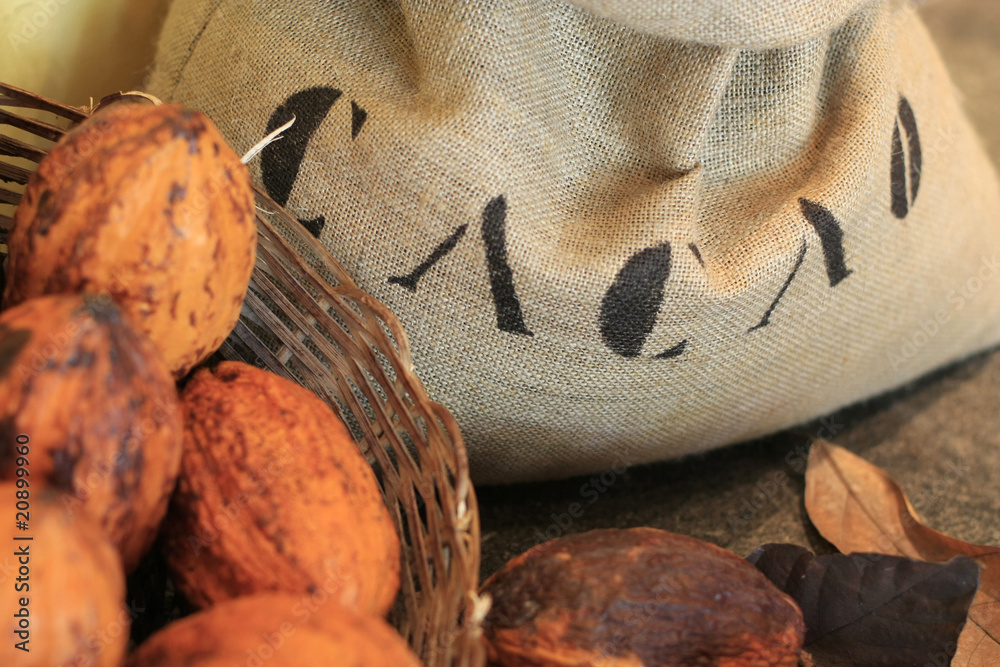 Sac de cacao et ses cabosses.