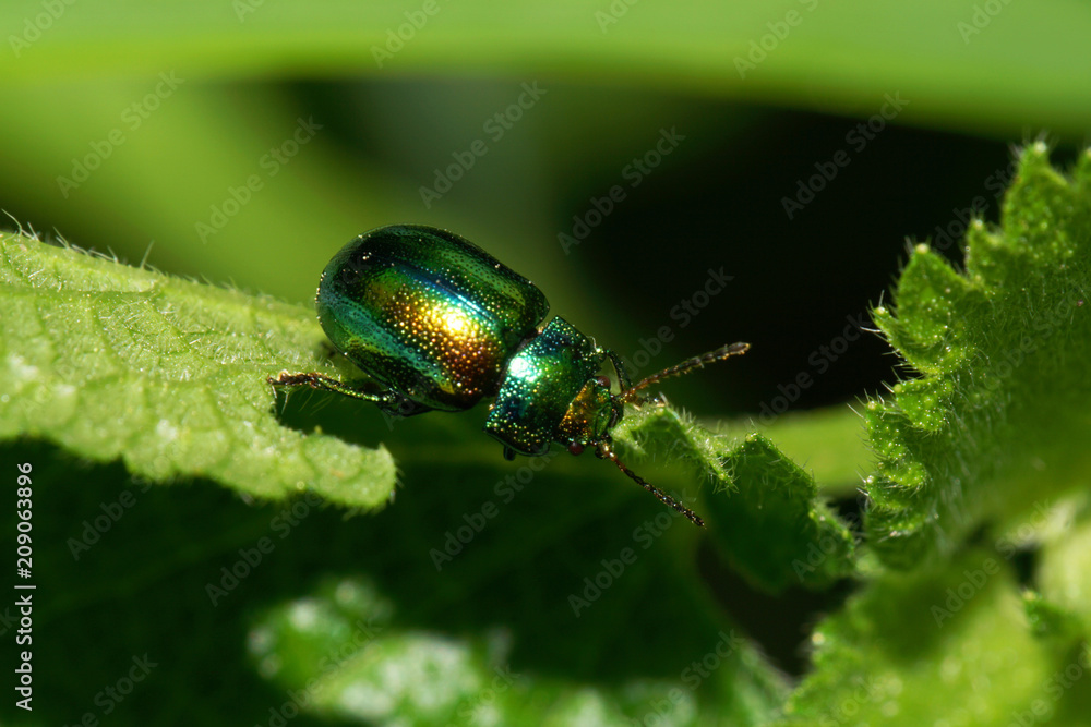 Macro view from above of a small green-red Caucasian beetle Chrysomelids