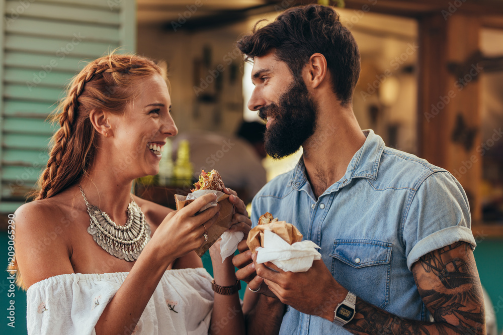 Couple enjoying eating food truck burger
