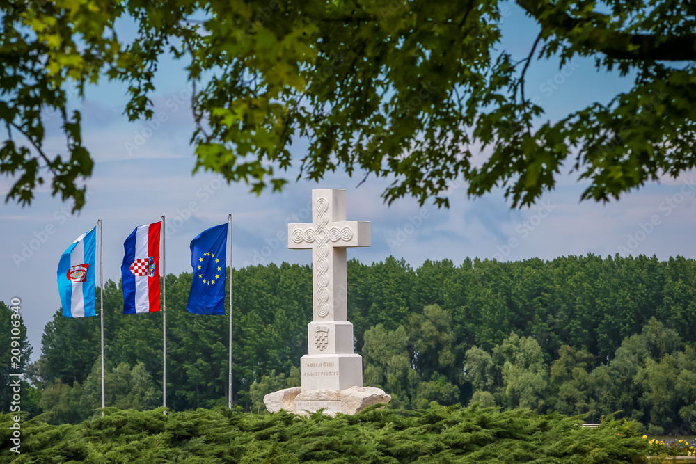 A view of the cross monument that says To victims of war for free Croatia in memory of croatian war defenders with flags hoisted next to it in Vukovar, Croatia.