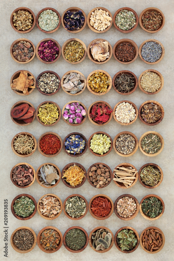 Large herbal medicine collection of dried herbs used in chinese and alternative remedies in wooden bowls on natural hemp paper background.