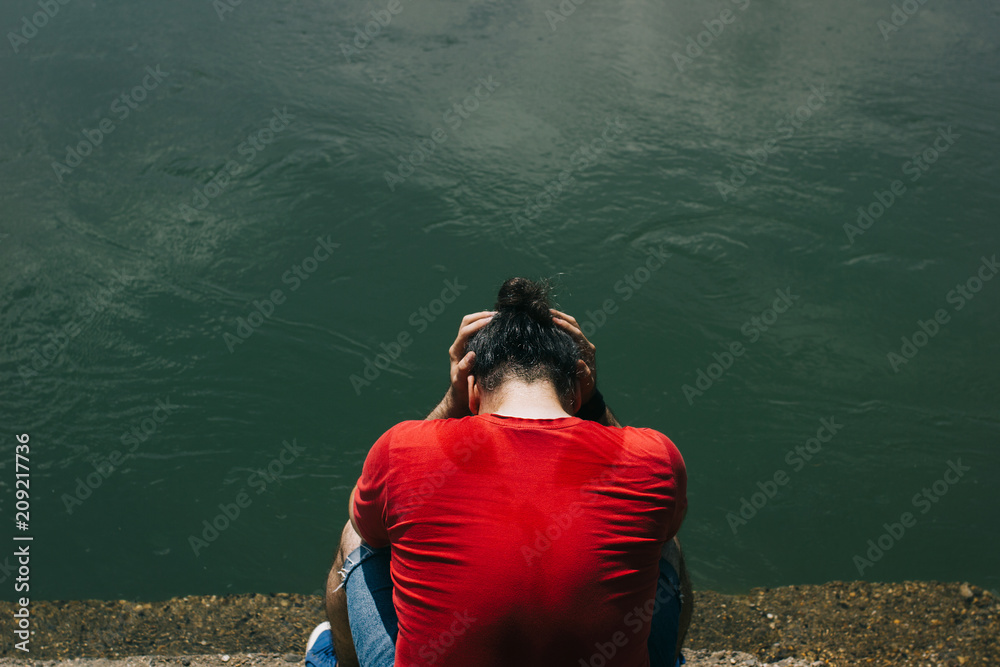 Sad, depressed man in red shirt sitting bay the murky green water, holding his hands on his had