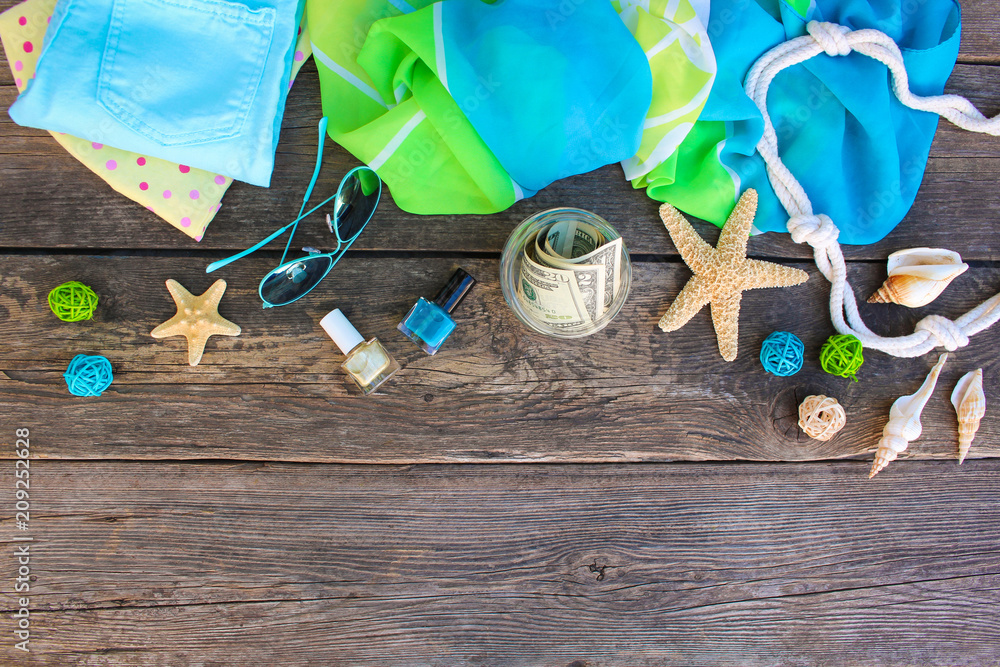 Dollars in glass jar. Concept of collecting money for journey. Top view, flat lay.