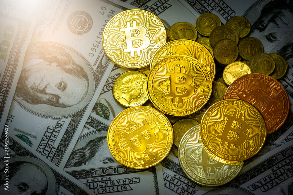 Golden bitcoins and coins placed on Dollar bills. cryptocurrency business concept